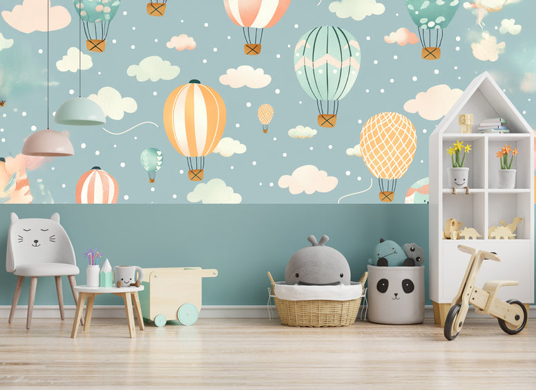 Pour un intérieur qui recherche une ambiance douce, joyeuse et aérienne, "Ballons Rêveurs" est un choix charmant. Ce papier peint présente un motif répété de montgolfières de différentes tailles et motifs (rayures, damiers) dans des couleurs pastel comme le corail, le jaune pâle, le vert menthe et le bleu clair. Elles flottent gracieusement dans un ciel bleu pastel parsemé de nuages moelleux et de petits points blancs. Ce design est idéal pour créer une atmosphère de légèreté et d'évasion, parfaite pour une chambre d'enfant ou un espace doux et inspirant.