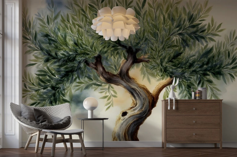 Pour un intérieur qui recherche une ambiance méditerranéenne et une connexion avec la nature, le papier peint "Olivier Solaire" est un choix chaleureux et élégant. Cette illustration détaillée dépeint un vieil olivier, avec son tronc noueux et ses branches tortueuses, dont le feuillage aux teintes de vert olive, de vert foncé et de gris est éclairé par une lumière douce et dorée. La finesse des détails et l'effet d'aquarelle donnent à l'ensemble une texture douce et artistique. Idéal pour un salon, une cuisine ou un bureau, il apporte une touche d'authenticité, de calme et une ambiance ensoleillée qui évoque les paysages du sud.