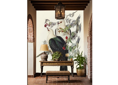 Pour un intérieur qui recherche une touche classique et une connexion avec la nature, "Pigeons Fruitiers" est un choix délicat. Ce papier peint présente une illustration détaillée de deux pigeons aux têtes blanches et aux corps sombres, dont les ailes arborent des reflets irisés. Ils sont perchés sur une branche ornée de feuilles aux tons doux et de baies rouges vibrantes, évoquant une scène d'un carnet de naturaliste. Le fond clair met en valeur la finesse du dessin et la beauté des oiseaux. Ce design est idéal pour créer une ambiance sereine et intemporelle, ajoutant une note d'élégance naturelle à une pièce.